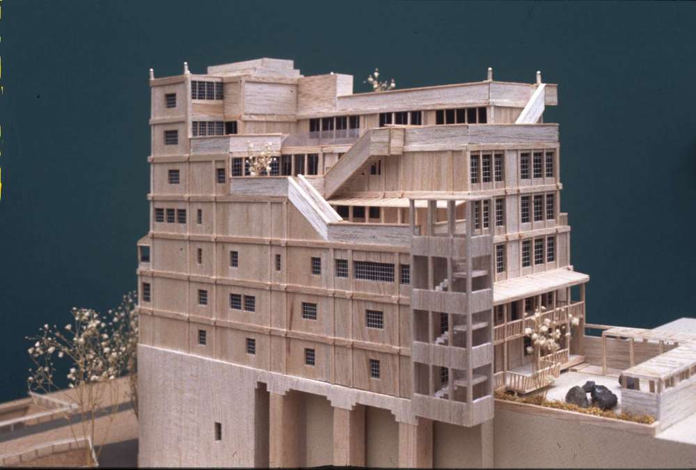 Three images of the balsa wood presentation model of the 10-story apartment building.