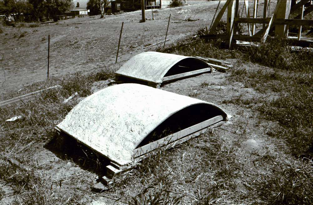 Martinez Tile Glazing Workshop: The first experimental all-gunite concrete building, with vaulted ceiling and pitched roof – Photographs of 1st step of construction process
