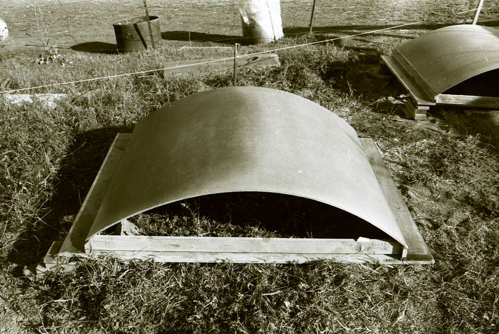 Martinez Tile Glazing Workshop: The first experimental all-gunite concrete building, with vaulted ceiling and pitched roof – Photographs of 1st step of construction process