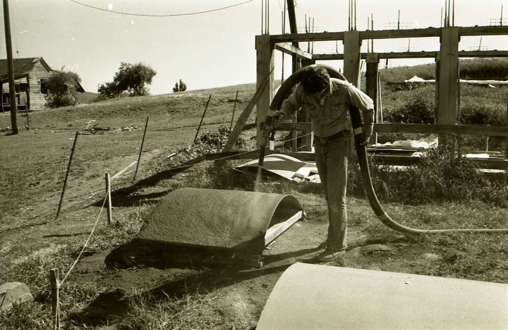 Martinez Tile Glazing Workshop: The first experimental all-gunite concrete building, with vaulted ceiling and pitched roof – Photographs of 1st step of construction process