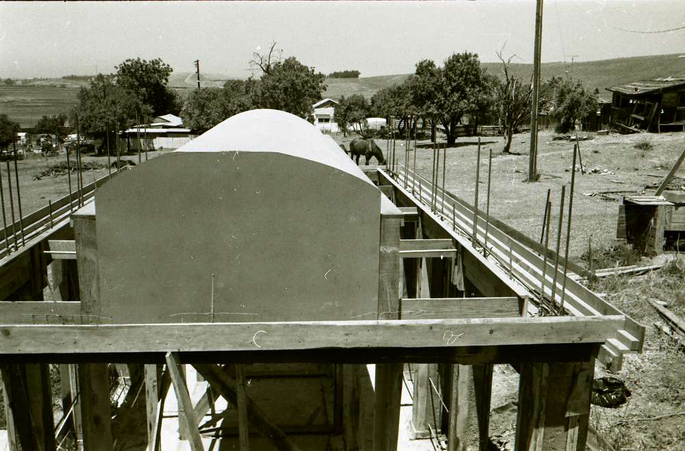 Martinez Tile Glazing Workshop: The first experimental all-gunite concrete building, with vaulted ceiling and pitched roof – Photographs of 2nd step of construction process