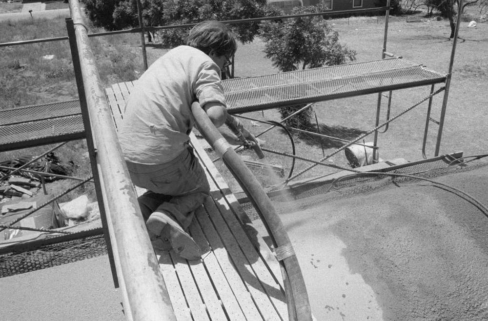 Martinez Tile Glazing Workshop: The first experimental all-gunite concrete building, with vaulted ceiling and pitched roof – Photographs of 3rd step construction stage