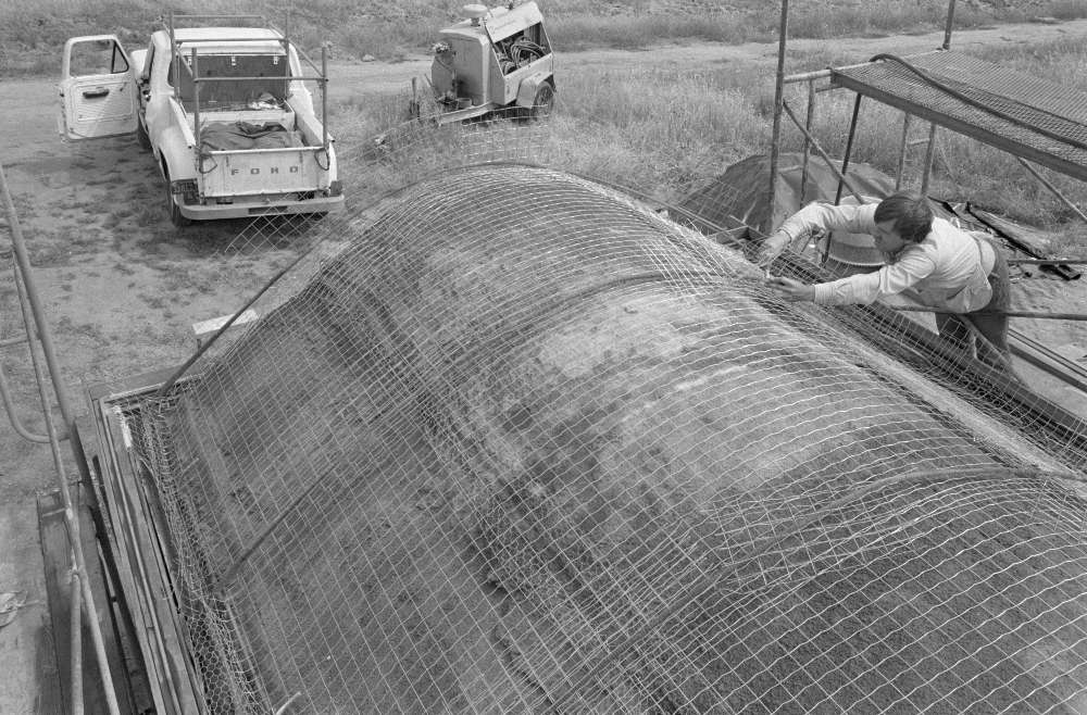 4) Placing and fastening steel mesh reinforcement, on top of the first cured layer of gunite