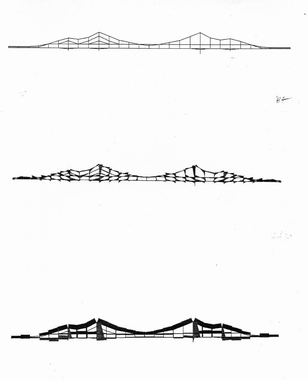 International competion entry for bridge over Rio Grande de Loiza, proposing a precast, pierced-concrete, long span shell design, 500 meter span.